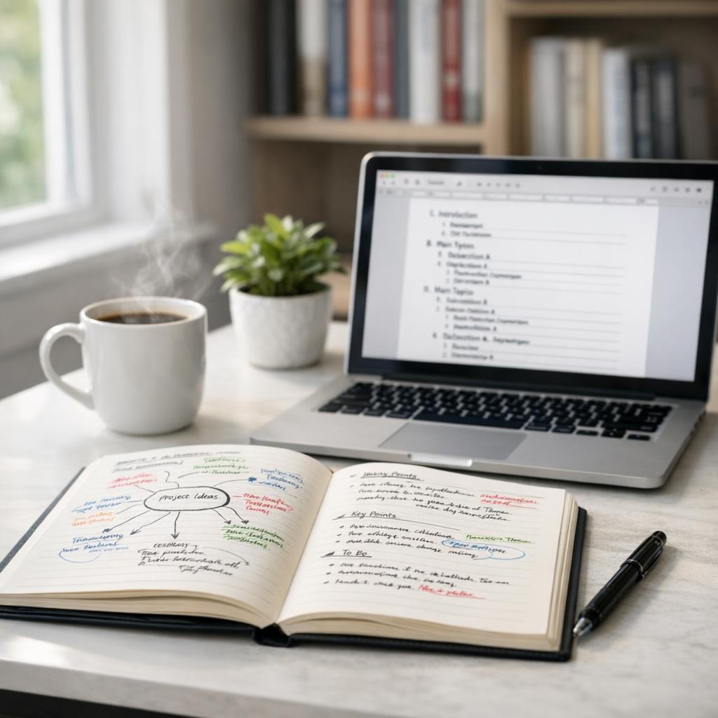Notiere zunächst alle Gedanken ungefiltert auf Papier oder digital. Dieses Brainstorming befreit den Geist und schafft Überblick. Sammle Schlagworte, Ideen, Fragen und relevante Fakten ohne Bewertung.